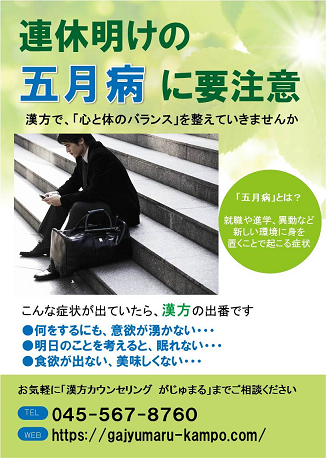 さて、今月から店先のPOPが「五月病」に変わりました。五月病のご相談は、ゴールデンウィークが終わってしばらく経ったこれからの時期から多くなってきます。特に、今年は10連休と大型連休になった方が多かったため、例年に比べて五月病になりやすい状況に思われます。今日は、その「五月病」について中医学から見ていきたいと思います。